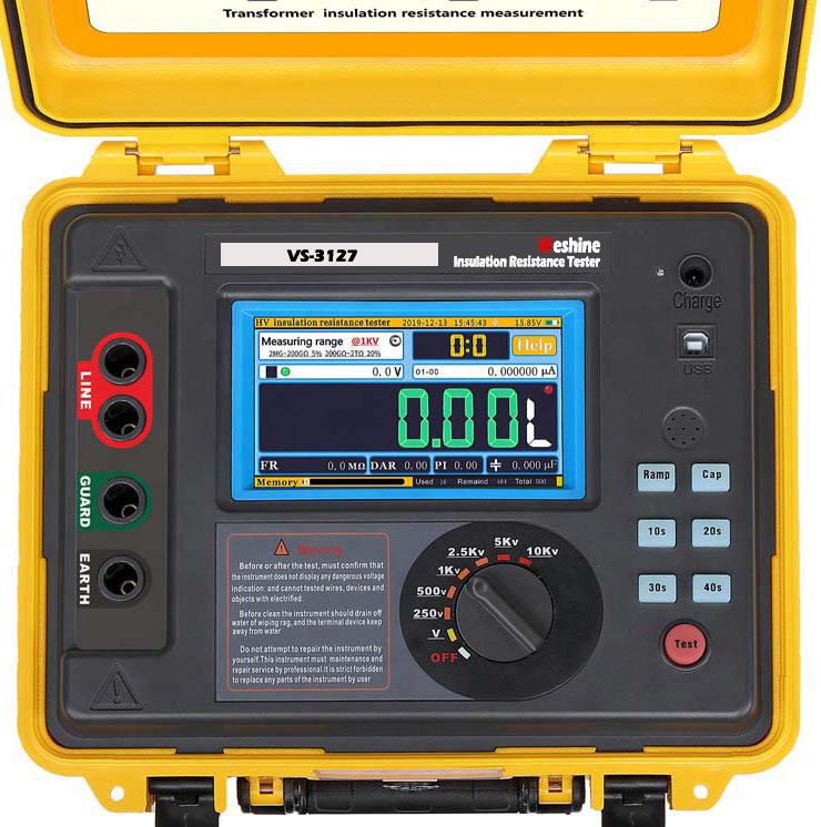 Weshine® VS-3127 jest zasilany bateriąTest izolacji transformatoraz cyfrowym i analogowym wyświetlaczem łuku, przeznaczony do badania rezystancji izolacji wysokim napięciem w konserwacji i serwisowaniu kabli, maszyn wirujących, transformatorów, rozdzielnic i zastosowań przemysłowych.