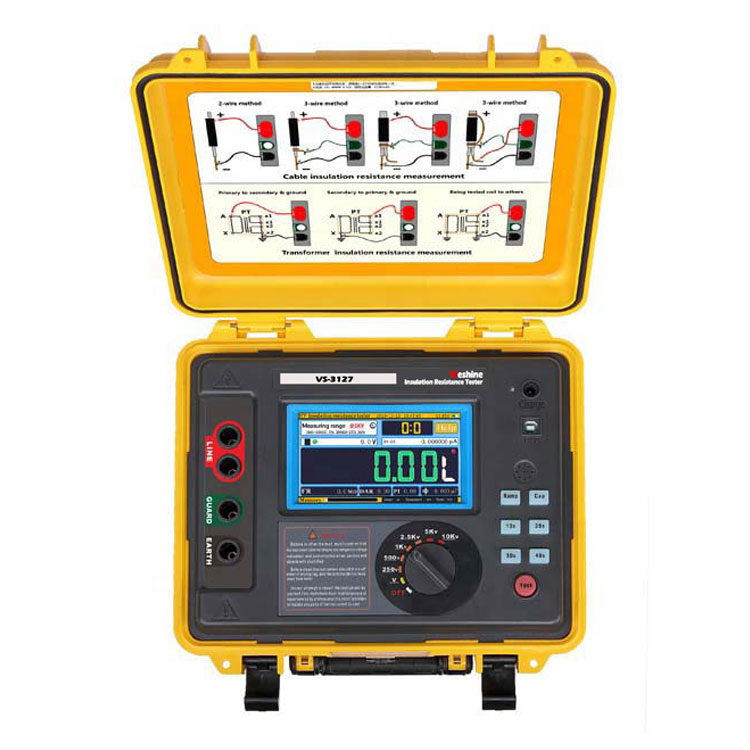 Weshine® VS-3127 jest zasilany bateriąTest megaomomierzaz cyfrowym i analogowym wyświetlaczem łuku, przeznaczony do badania rezystancji izolacji wysokim napięciem w konserwacji i serwisowaniu kabli, maszyn wirujących, transformatorów, rozdzielnic i zastosowań przemysłowych.